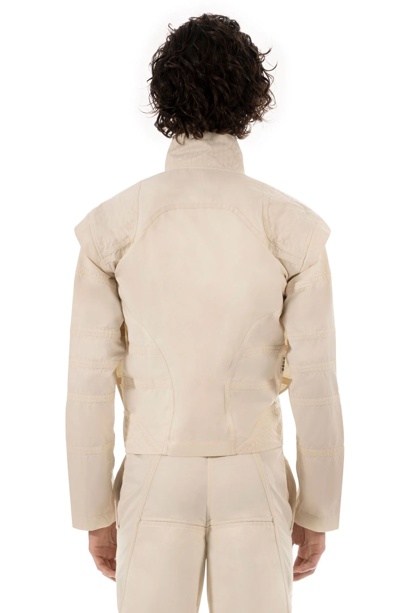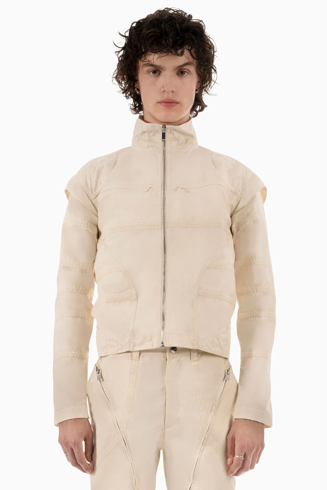 Signature tailored jacket, champagne colour-way. Fitted silhouette. Lightweight with no lining. “AUTOBAHN” seam detailing. Four pockets. Silver hardware.