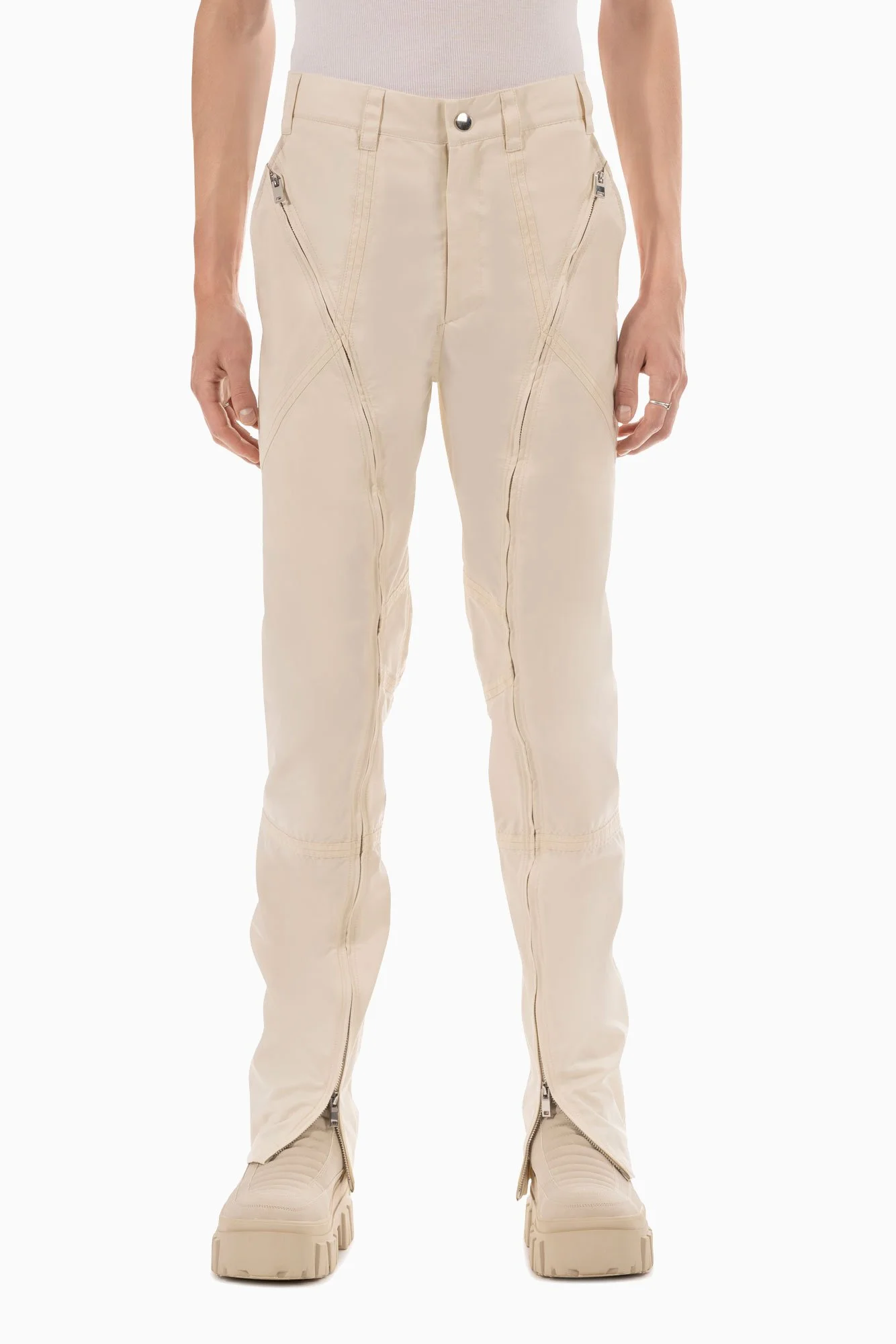 Signature tailored trouser, champagne colour-way. Fitted silhouette. Signature “AUTOBAHN” seam detailing. Full length front leg zip. Six pockets. Silver hardware.